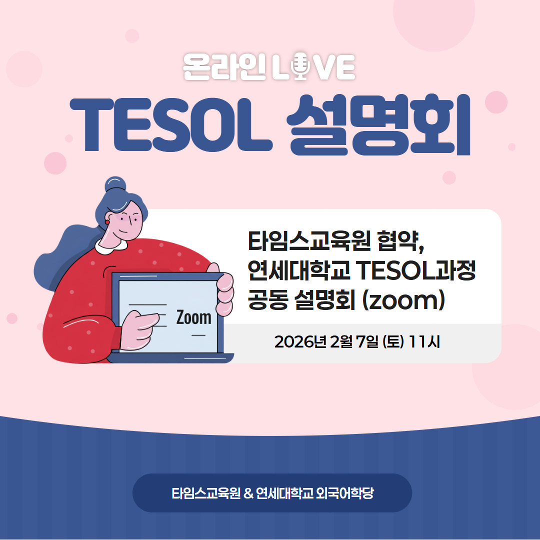 2/7(Åä) ¿ÀÀü 11½Ã, ¿¬¼¼´ë¿¡¼ ÁøÇàµÇ´Â ¸¶Áö¸· ¿Â¶óÀÎ TESOL ¼³¸íȸÀÔ´Ï´Ù.